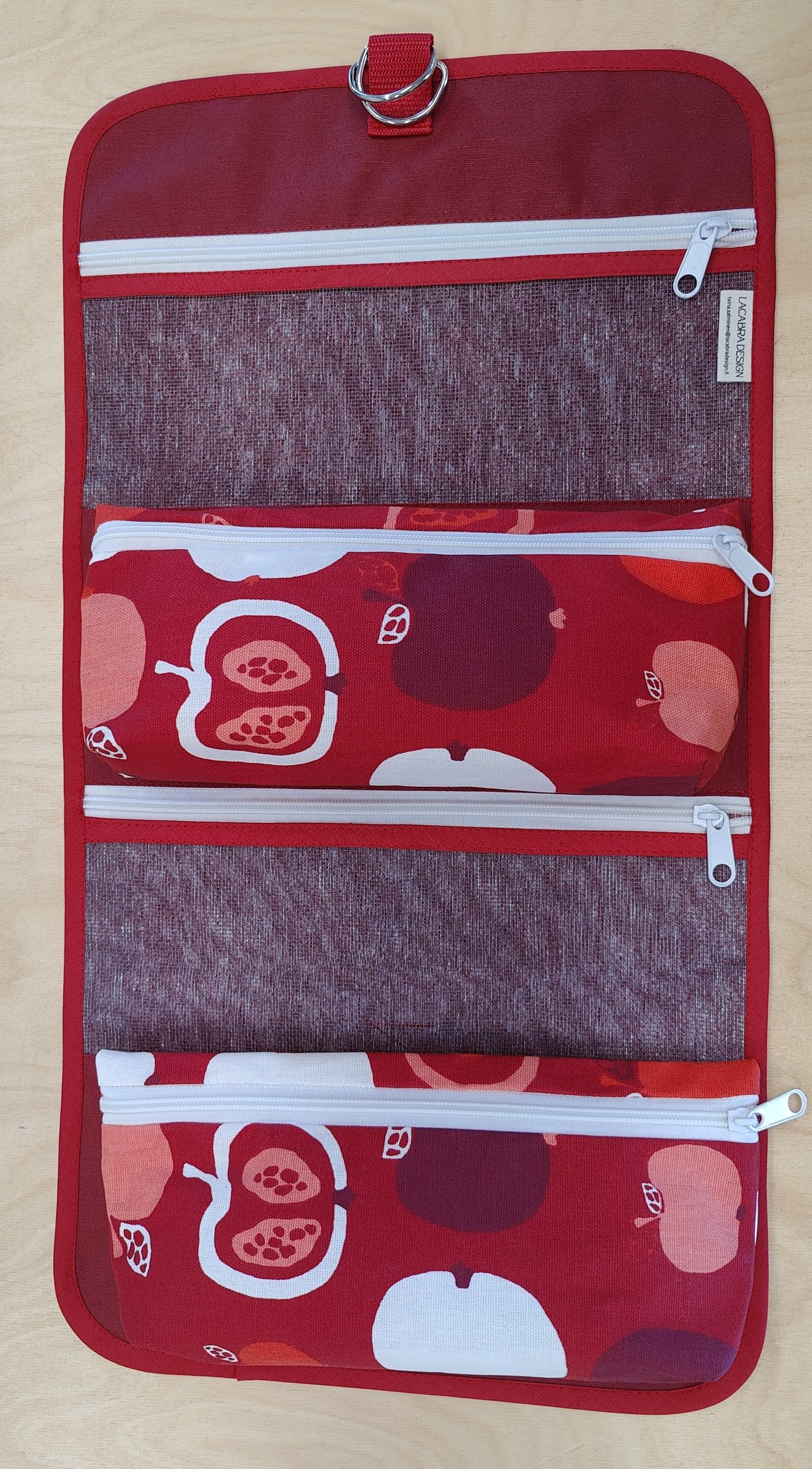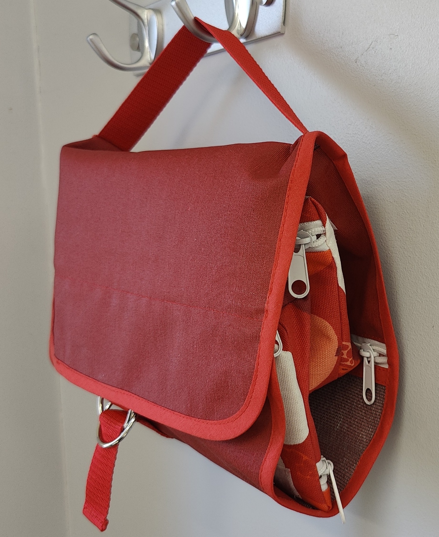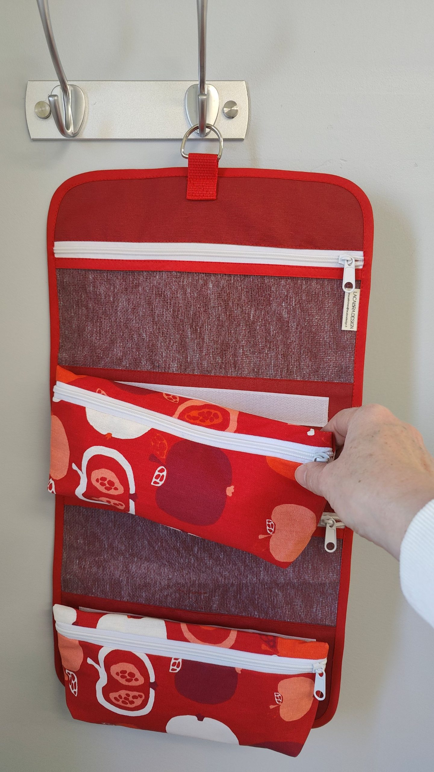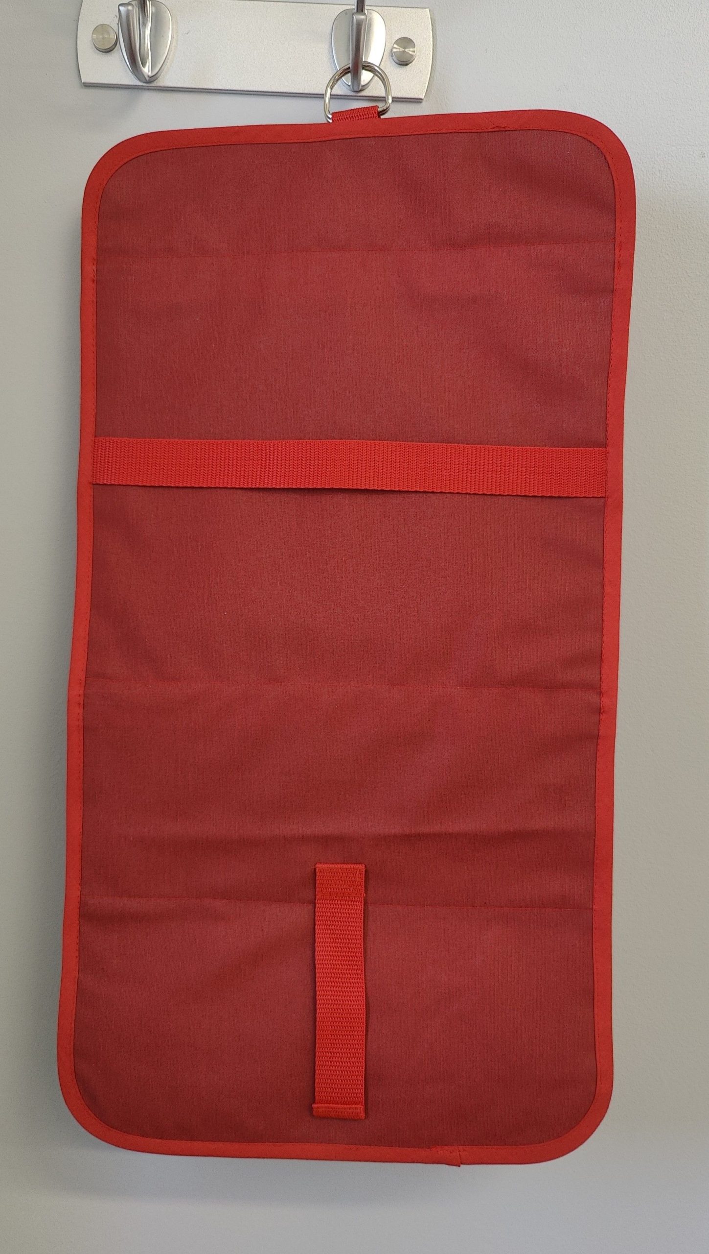 Auki levitettävän toilettilaukun pakkaat helposti matkalaukkuun viimeiseksi juuri ennen lähtöä. Kylpyhuoneissa laskutilaa on usein vain käsienpesualtaan vieressä ja siinä toilettipussin pohjaa kastuu helposti. Avattuna ja pyyhekoukkuun ripustettuna tätä ongelmaa ei ole ja toilettilaukusta on kätevä ottaa hygienia-tuotteita käyttöön.