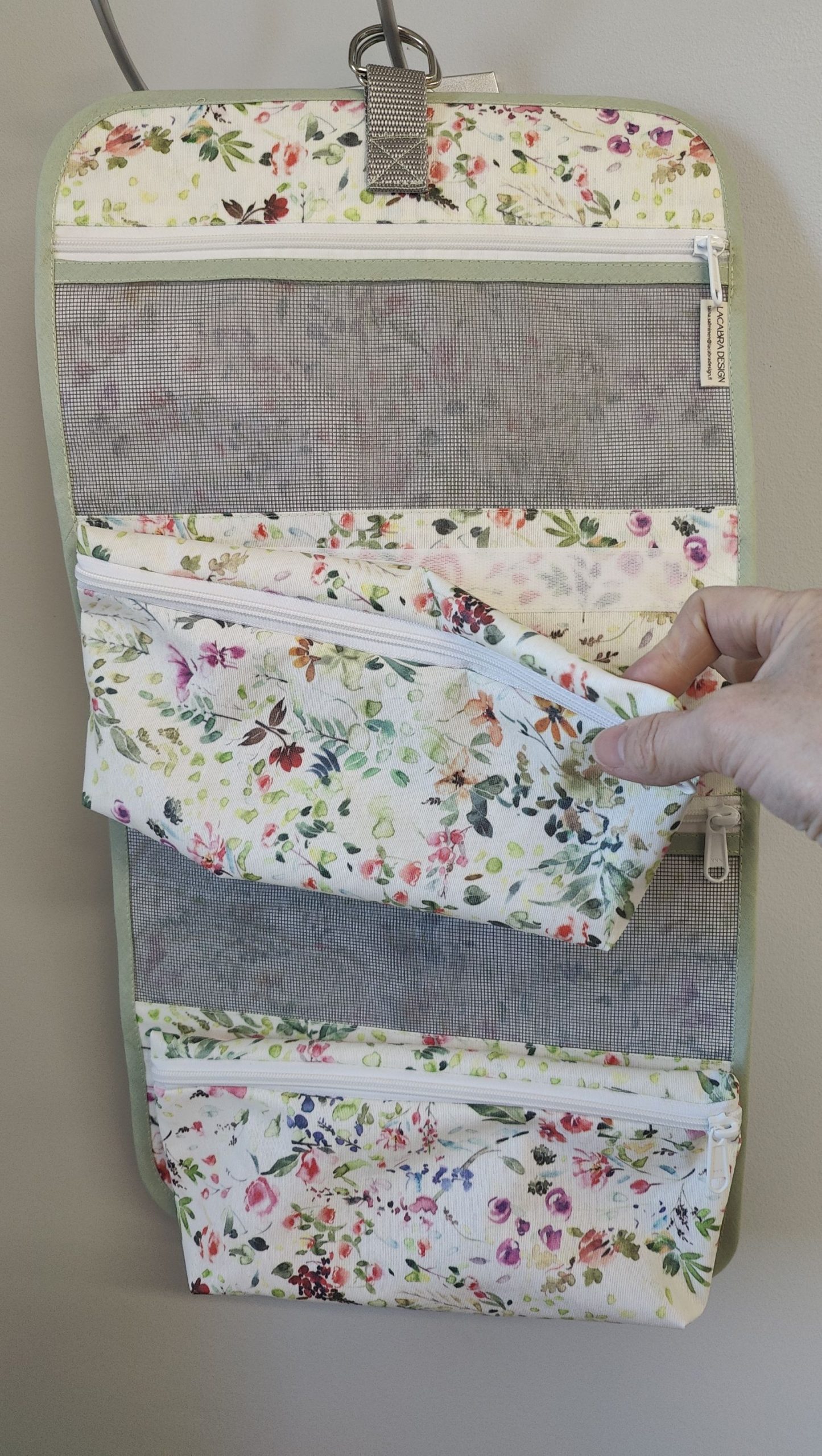 Toilettilaukussa on kantohihna ja se suljetaan D-lenkkien ja tukevan nauhan avulla. D-lenkkejä käytetään myös ripustuksessa.