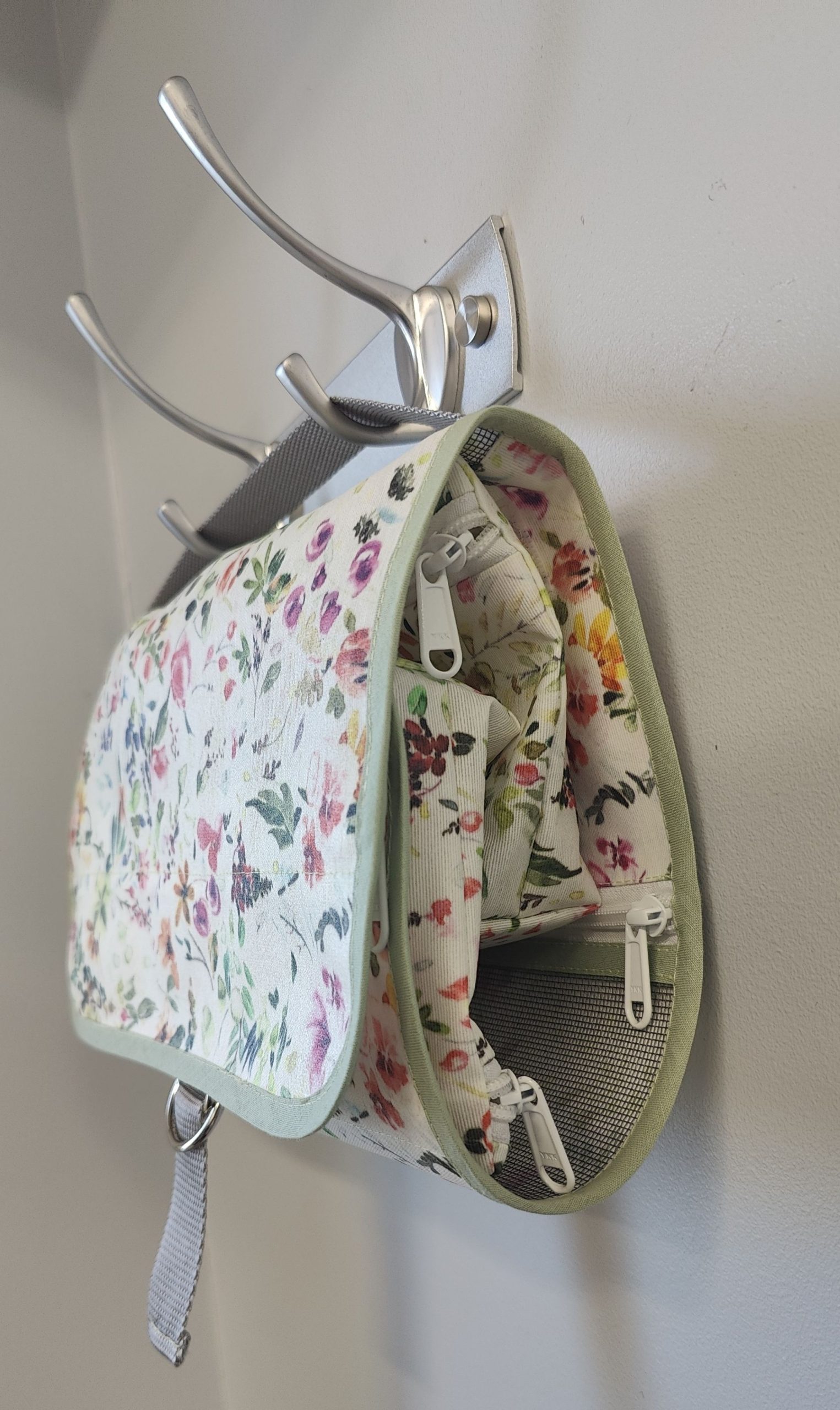 Auki levitettävän toilettilaukun pakkaat helposti matkalaukkuun viimeiseksi juuri ennen lähtöä.  Kylpyhuoneissa laskutilaa on usein vain käsienpesualtaan vieressä ja siinä toilettipussin pohjaa kastuu helposti. Avattuna ja pyyhekoukkuun ripustettuna tätä ongelmaa ei ole ja toilettilaukusta on kätevä ottaa hygienia-tuotteita käyttöön.