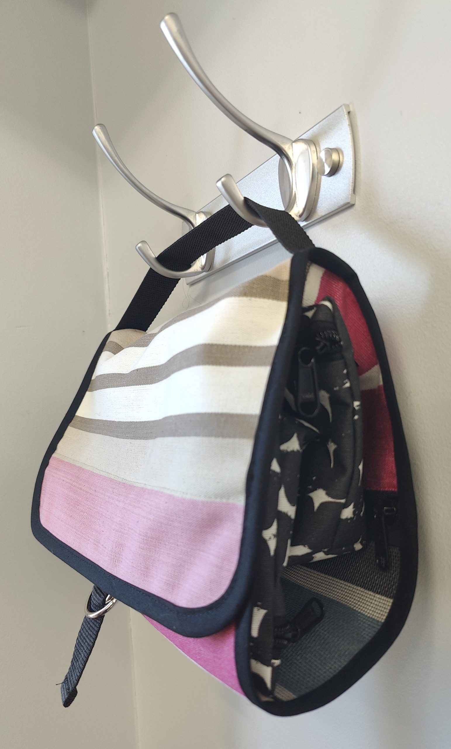 Auki levitettävän toilettilaukun pakkaat helposti matkalaukkuun viimeiseksi juuri ennen lähtöä.  Kylpyhuoneissa laskutilaa on usein vain käsienpesualtaan vieressä ja siinä toilettipussin pohjaa kastuu helposti. Avattuna ja pyyhekoukkuun ripustettuna tätä ongelmaa ei ole ja toilettilaukusta on kätevä ottaa hygienia-tuotteita käyttöön.