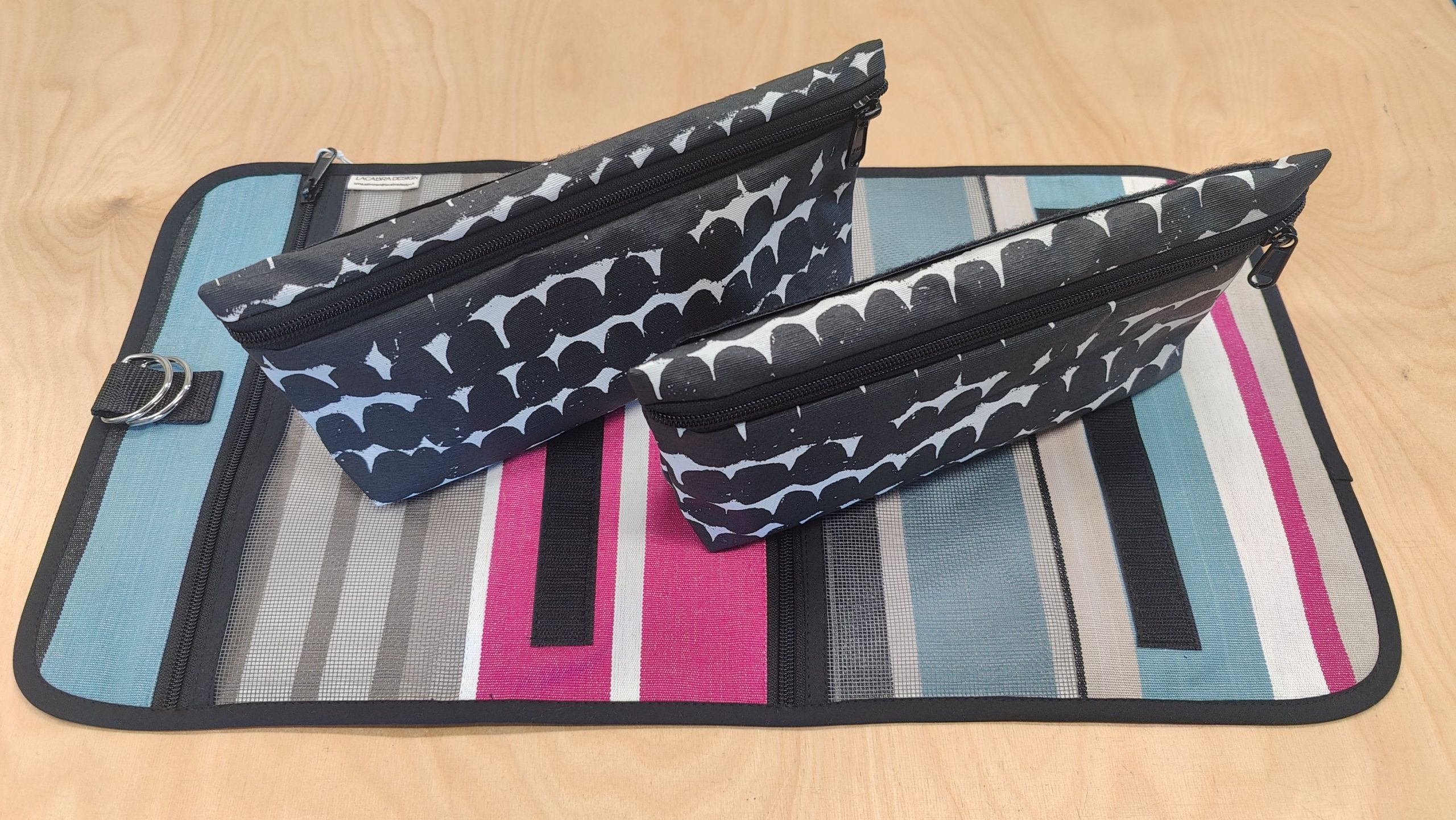 Kaksi irrotettavaa meikkipussia, koko noin 10x28cm, pohjan leveys 5cm