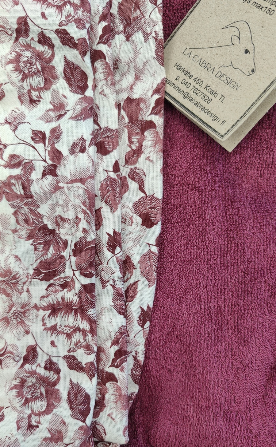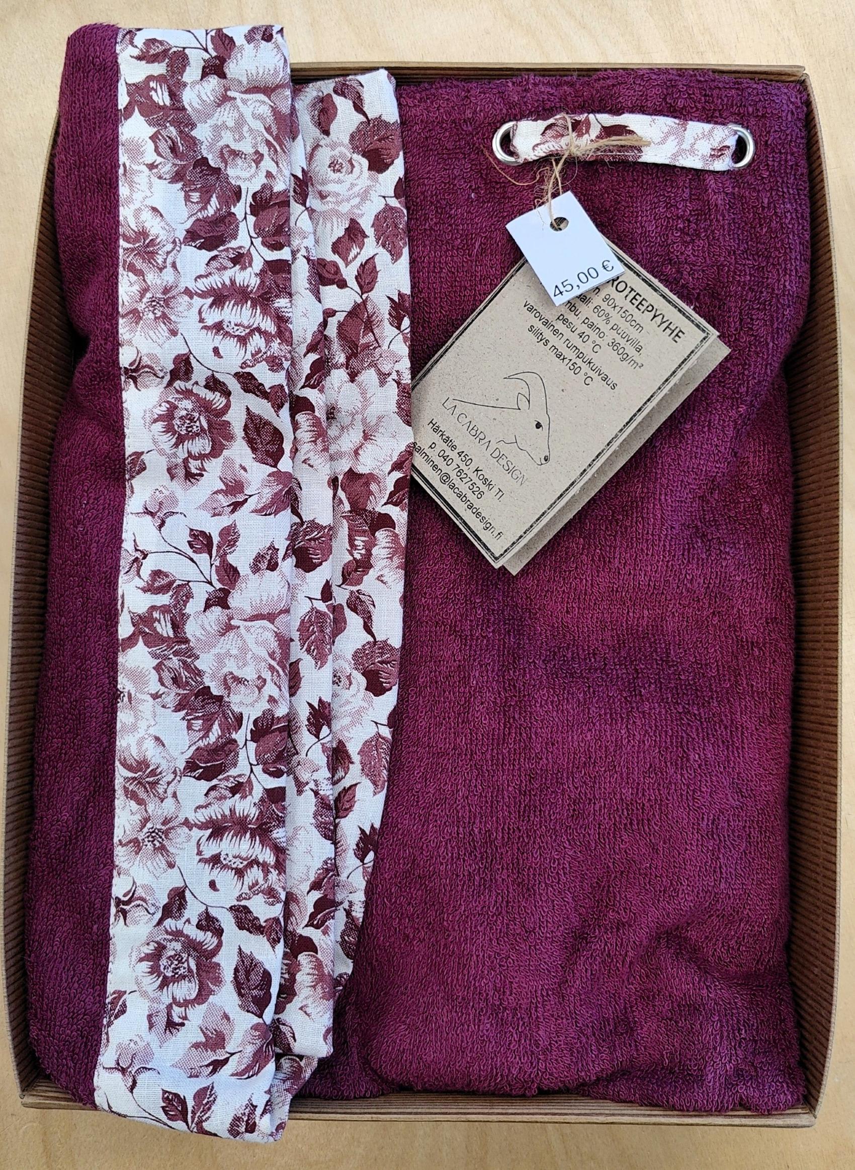 Kylpypyyhe on valmistettu laadukkaasta puuvilla-bambufroteesta. Se on erittäin pehmeä ja imukykyinen. Kangassomisteella pyyhkeisiin on luotu raikkautta ja yksilöllisyyttä. Erikoisuutta tuotteelle tuo pyyhkeen ripustuslenkki, joka kulkee hauskasti metallirenkaiden läpi.