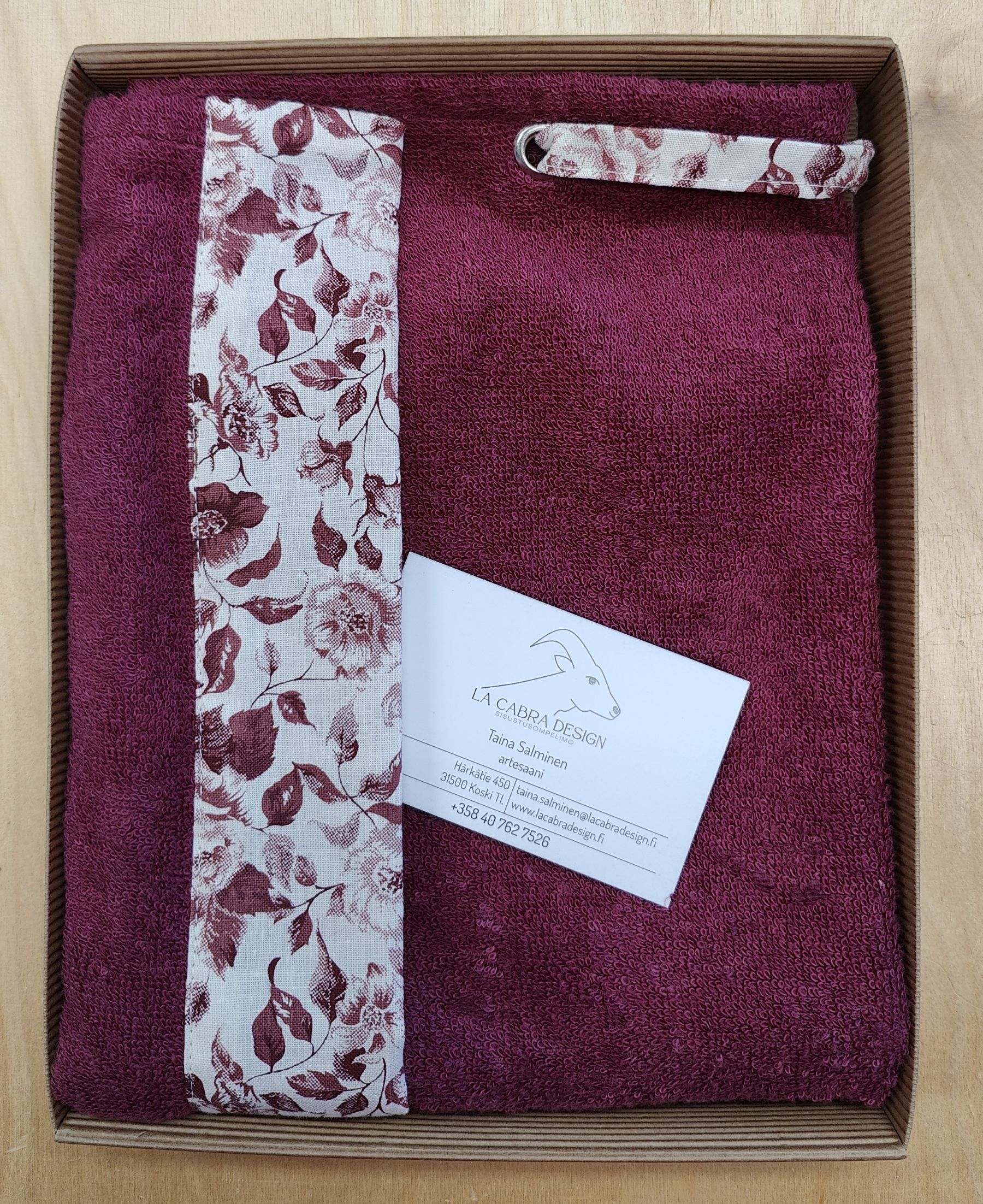 Käsipyyhe on valmistettu laadukkaasta puuvilla-bambufroteesta. Se on erittäin pehmeä ja imukykyinen. Kangassomisteella pyyhkeisiin on luotu raikkautta ja yksilöllisyyttä. Erikoisuutta tuotteelle tuo pyyhkeen ripustuslenkki, joka kulkee hauskasti metallirenkaiden läpi.